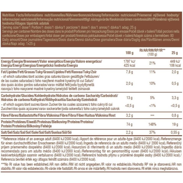 chocolate-cinnamon: pea protein isolate, rice protein, fat-reduced cocoa powder,L-Glutamine, flavour enhancer (glycine and its sodium salt), L-Arginine, emulsifier: lecithins (soy), cinnamon, thickeners (carrageenan, cellulose gum), quinoa flour 1.6%, flavourings, goji berry powder 1.1%, acai berry powder0.6%, salt, sweetener (sucralose).
